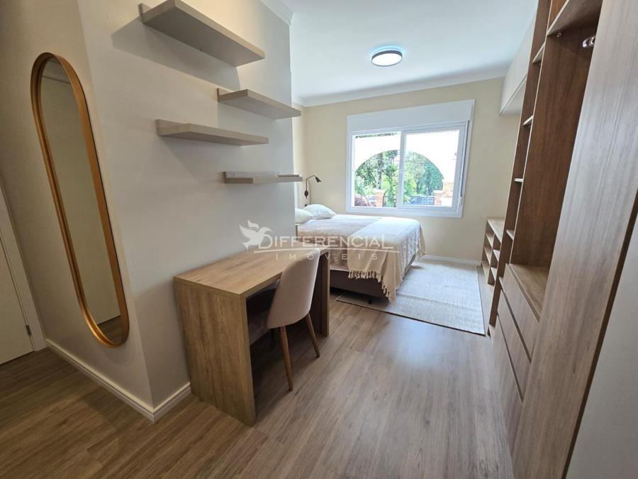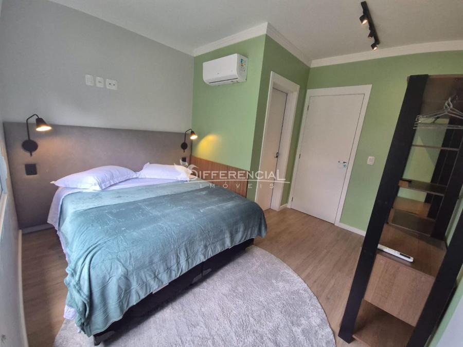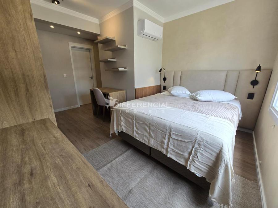 Esquadrias em PVC com vidro duplo, ar condicionado, piso porcelanato e laminado.
