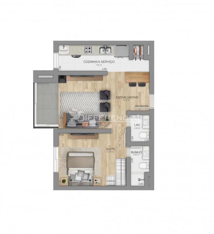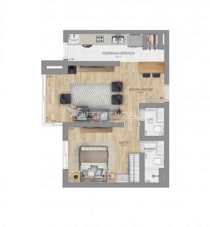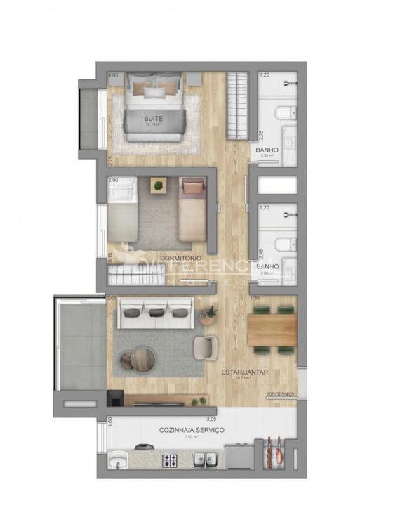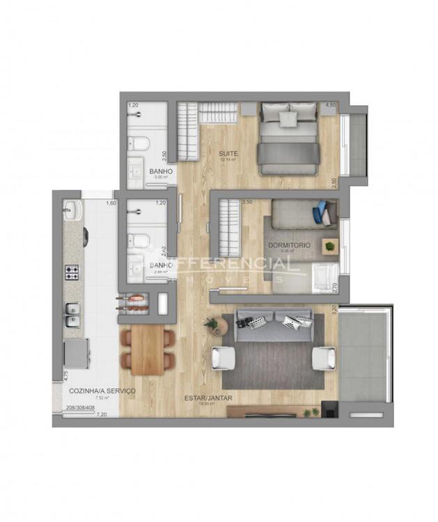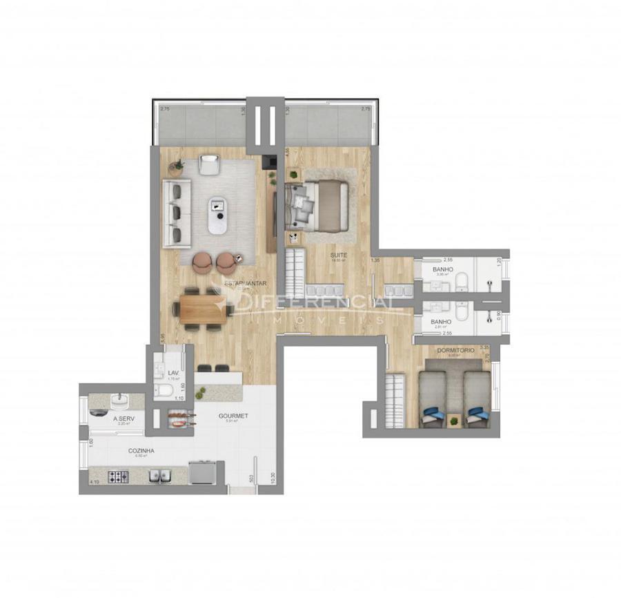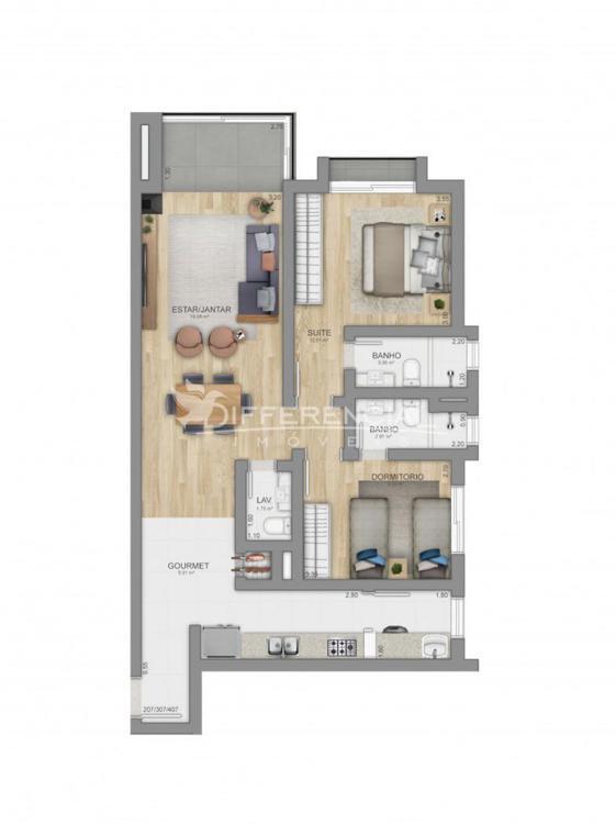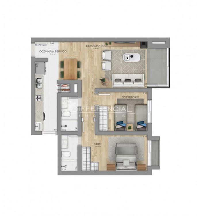 3 dormitórios (sendo 1 suíte), sala de estar, jantar, cozinha, churrasqueira, sacada, lavanderia, lavabo, hall de entrada.