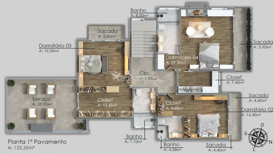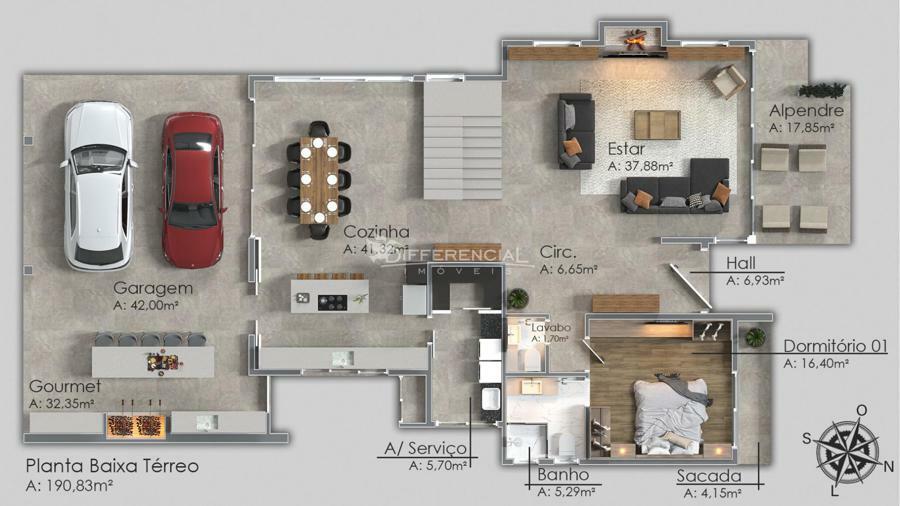4 suítes, sala de estar, jantar, cozinha, churrasqueira, lavanderia, lavabo, hall de entrada, 2 vagas de garagem.